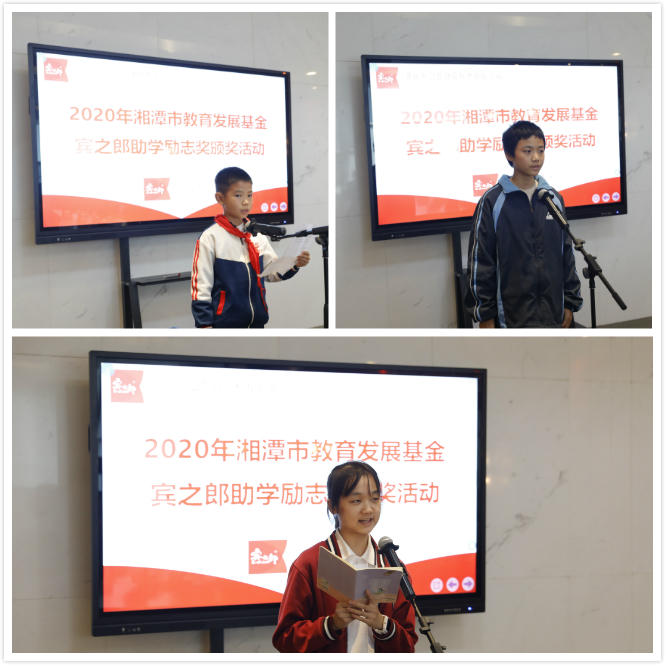 湘潭市政協(xié)副主席周佩珞宣讀《關(guān)于表彰2020年湘潭市教育發(fā)展基金·賓之郎助學(xué)勵(lì)志獎(jiǎng)獲獎(jiǎng)學(xué)生通報(bào)》,2020年,共有349名同學(xué)獲得“賓之郎·助學(xué)勵(lì)志獎(jiǎng)”表彰獎(jiǎng)勵(lì)。他表示,希望獲獎(jiǎng)同學(xué)以堅(jiān)強(qiáng)的意志,砥礪奮斗,處逆境而立志成才;也希望廣大中小學(xué)生以獲獎(jiǎng)學(xué)生為榜樣,樹立遠(yuǎn)大理想,發(fā)奮學(xué)習(xí),做有理想、有志向、有擔(dān)當(dāng)?shù)男聲r(shí)代好少年,為實(shí)現(xiàn)中華民族偉大復(fù)興而拼搏奮進(jìn)。