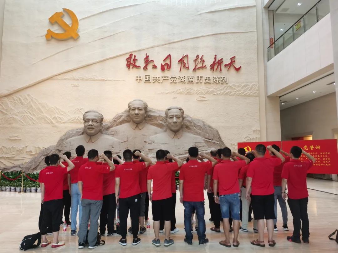 在湖南黨史陳列館序廳,名為“瀟湘魂”的毛澤東、劉少奇、任弼時(shí)三位偉人的半身雕塑前,大家面對黨旗,舉起右手緊握拳頭,重溫了入黨誓詞,現(xiàn)場氣氛莊嚴(yán)而肅穆。