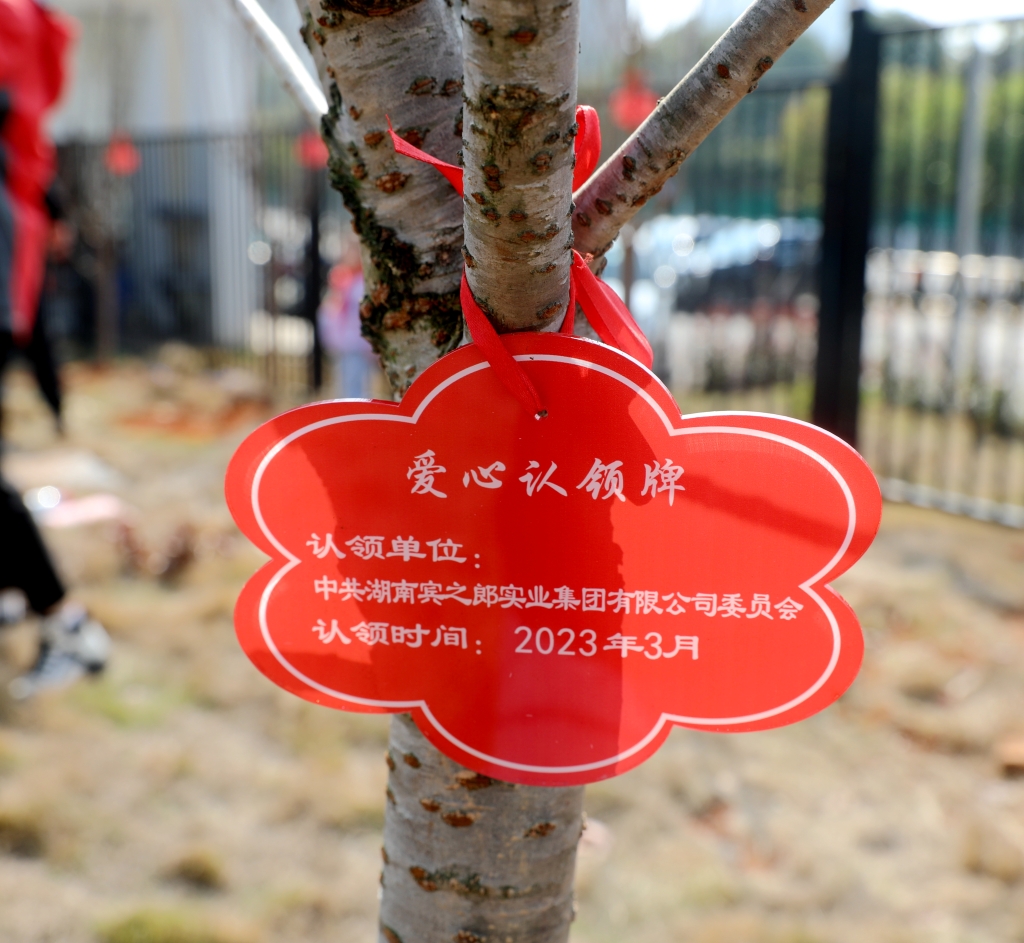 完成種植后,大家為樹苗系上獨屬賓之郎黨委的愛心認領(lǐng)牌,并與小樹合影留念。